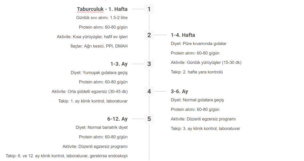 İlk 30 gün takip kriterleri ve önlemler, erken postoperatif dönemde komplikasyonların tespiti ve yönetimi için önemlidir. Revizyon cerrahisi sonrası hastalar, genellikle 1-3 gün hastanede kalır ve taburculuk öncesi vital bulgular, laboratuvar değerleri ve oral alım durumu değerlendirilir. Taburculuk sonrası ilk kontrol, genellikle 7-10. günde yapılır ve yara iyileşmesi, oral alım, hidrasyon durumu ve erken komplikasyon belirtileri değerlendirilir. İkinci kontrol, genellikle 2-4. haftada yapılır ve diyet ilerlemesi, vitamin-mineral takviyesi, fiziksel aktivite ve kilo kaybı değerlendirilir. Bu dönemde, anastomoz kaçağı, kanama, enfeksiyon, tromboembolik olaylar ve kardiyopulmoner komplikasyonlar açısından dikkatli olunmalıdır. Şüpheli durumlarda, kontrastlı görüntüleme, endoskopi veya BT gibi tetkikler yapılabilir.